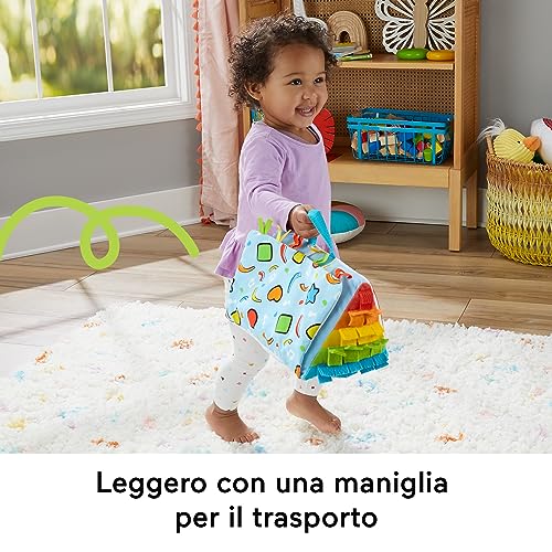 Un gioco sensoriale entusiasmante su ogni lato: un grande specchio per imparare a conoscersi, un pannello scricchioloso, tasti morbidi e fantasie ad alto contrasto che stimolano le capacità sensoriali