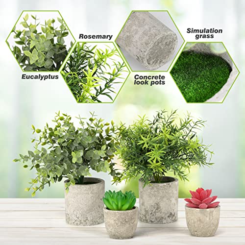 FISHOAKY 4 Pezzi Piante Finte Artificiali in Vaso, Piante Artificiali da Interno con Vasi Grigi, Eucalipto, Rosmarino e 2 Mini Piante Grasse Finte, Decorazioni da Cucina, Bagno, Ufficio, Soggiorno