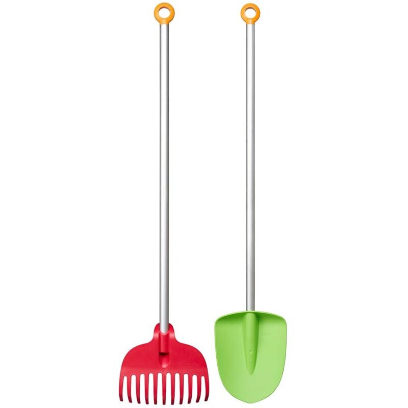 Descrizione Set composto da vanga e rastrello per bambini (lunghezza totale: 88 cm e 83 cm), Vanga per terreni più o meno duri e per sabbia, Rastrello per raccogliere da vialetti o prati foglie, erbacce ed erba appena tagliata - Vanga con lama molto resistente anche per terreni duri, Rastrello efficiente e facile da usare grazie agli 11 denti stabili e alla larghezza di 19 cm della testa dell'attrezzo - Facili da usare grazie al manico stabile dalla lunghezza adatta per la statura dei bambini, Impugnatura circolare arancione per una presa sicura, Anello su estremità a cui appendere gli attrezzi - Peso ridotto grazie al manico leggero in alluminio, adatto per un utilizzo da parte di bambini, Lunga durabilità grazie alla lama e ai denti in plastica stabile e robusta rinforzata con fibra di vetro - Contenuto: 1 Set MyFirst Fiskars con vanga e rastrello per bambini, Lunghezza: 88 cm e 83 cm, Larghezza testa: 15 cm e 19 cm, Peso totale: 394 g, Materiale: Plastica rinforzata con fibra di