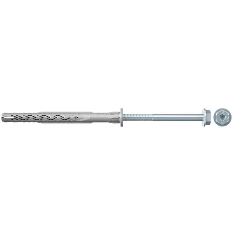 Il fissaggio del telaio fischer SXRL-FUS è approvato con la vite a testa esagonale fischer con rondella incorporata e supporto Bit TX40 integrato per fissaggi multipli di sistemi non portanti in muratura, calcestruzzo e calcestruzzo poroso. Nella muratura forata le due zone di dilatazione del tassello conducono la forza in modo uniforme, nel calcestruzzo poroso e nei materiali solidi queste sono unite ad un lungo elemento di dilatazione. Con la vite di sicurezza in acciaio elettrozincato il fissaggio al telaio è ideale per il fissaggio di sistemi di controtelai di facciate, coperture e coperture metalliche.