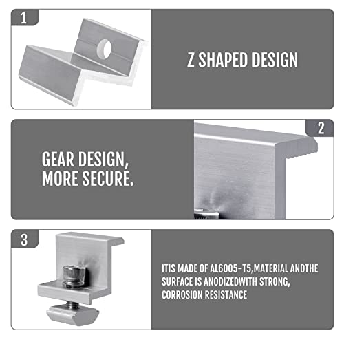 Materiale in lega di alluminio di alta qualità: queste clip di montaggio solare da 35 mm sono realizzate in alluminio (AL6005-T5), i componenti della clip solare sono anodizzati per un'elevata resistenza, resistenza alla corrosione e resistenza ai raggi UV, quindi sono più resistenti rispetto alle normali clip di montaggio in alluminio