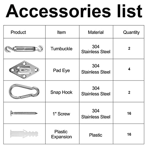 Kit tutto in uno: serie M5 di kit di fissaggio vela parasole in acciaio inossidabile 304 include i seguenti: 2 tenditori regolabili, 2 ganci a scatto, 4 x occhio pad, 16 x vite, 16 x espansione in plastica.