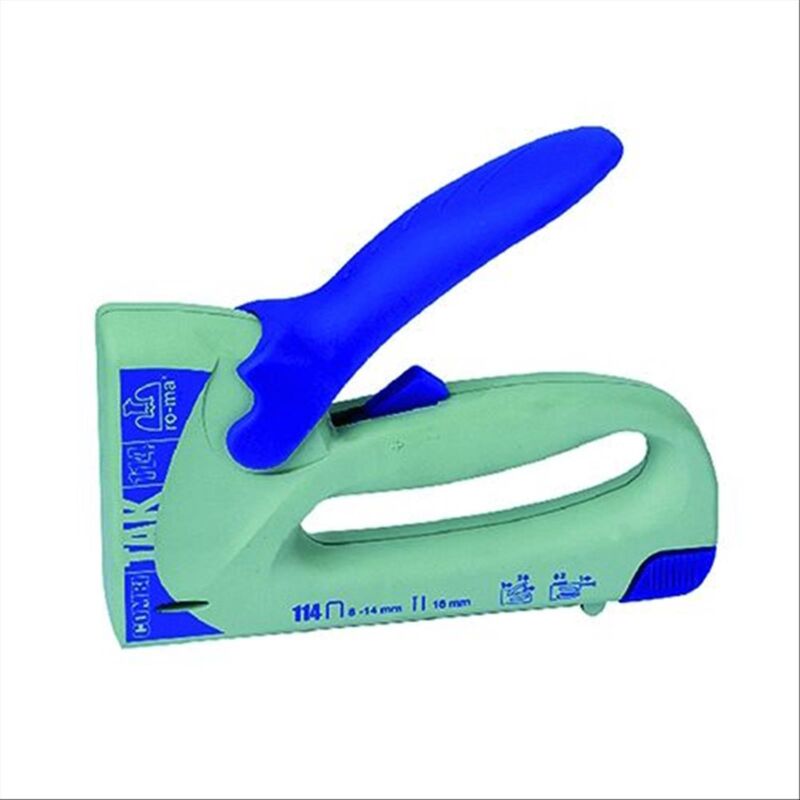 Mod. COMBI TAK 114 corpo in resina ABS antiurto. Leva in acciaio con copertura in plastica. Carica inferiore anti inceppamento. Per punti con passo 11,2 mm e altezza 8÷14 mm Monta punti 108 - 110 - 112 - 114 Chiodini con testa da 15 mm