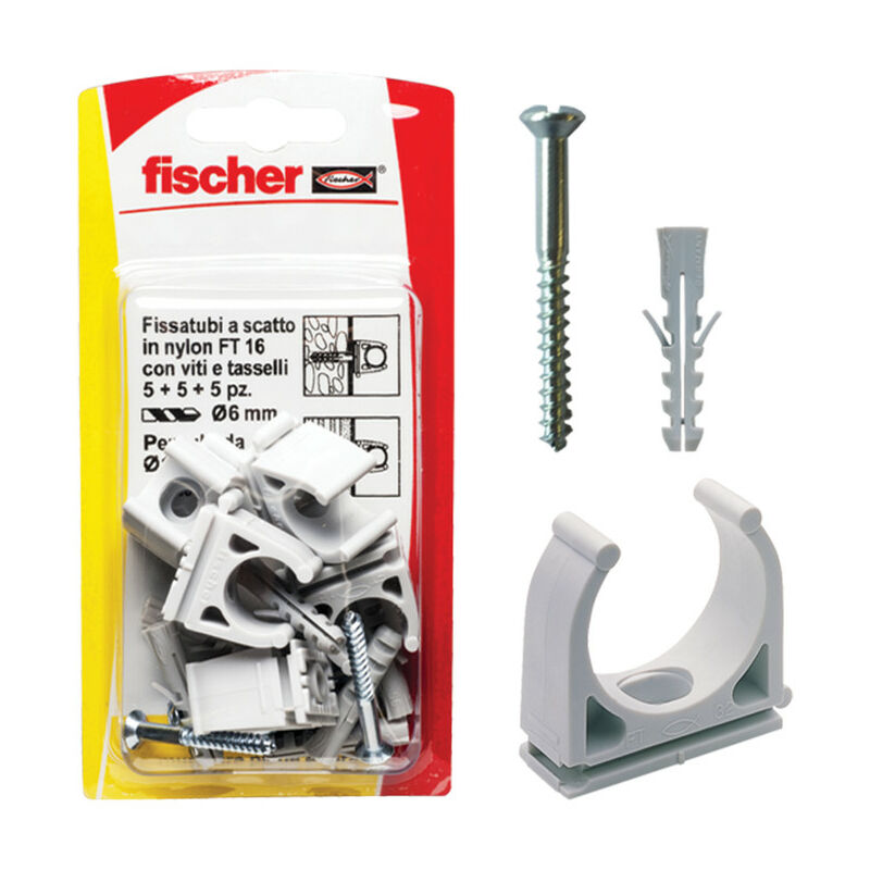 Fischer FT K Clip fissatubo aperto FT K in blister Materiali di supporto: Con il fissaggio S in: - Calcestruzzo - Mattone pieno in laterizio - Mattone pieno di silicato di calcio - Blocco pieno in calcestruzzo alleggerito - Pietra naturale con struttura compatta Con i fissaggi DUOPOWER, UX, SX e FU anche in: - Mattone semipieno (perforato verticalmente) in laterizio - Mattone semipieno (perforato verticalmente) in silicato di calcio - Blocco cavo in calcestruzzo alleggerito - Calcestruzzo aerato autoclavato (calcestruzzo cellulare) - Pannelli pieno in gesso Vantaggi: - Un solo componente. - Foro ad asola per una semplice e veloce regolazione del fissaggio a parete. - Temperatura di posa: -10°C +50°C.Temperatura di esercizio: -40°C +80°C. - Indicatore per l'allineamento. - Guida per installazioni in canaline. - Collegamento in serie con aggancio laterale. - Grado di autoestinguenza: classe HB - U.L. 94. Applicazioni: - Utile per fissare tubi per installazioni elettriche secondo CEI