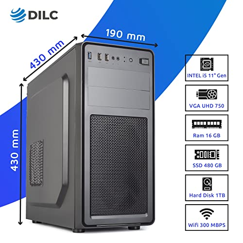 DILC, Pc Fisso DILC Business 5, Intel Core i5-11400, Pc Fisso Windows 11 PRO, 4.40 GHz, RAM 16 GB, SSD 480 GB, Hard Disk 1 TB, WiFi 300 mbps, Alimentatore 500W 80+, Pc Ufficio e Casa