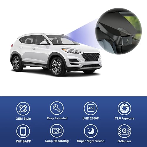 Fitcamx Dashcam 4K Compatibile con Hyundai Tucson (3rd Gen) 2016-2021, OEM Car Camera UHD 2160P WiFi, visione notturna, registrazione in loop, G-Sensor, WDR, Plug & Play, 64GB Card