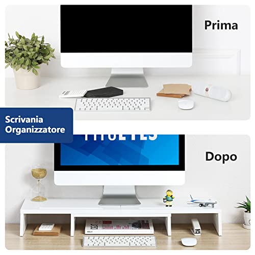 【STABILITÀ】 Il nostro riser per monitor è adatto al monitor del PC e al laptop, con due supporti per il telefono. I piedini in gomma antiscivolo mantengono la stabilità ed evitano di scivolare e graffiare sulla scrivania.