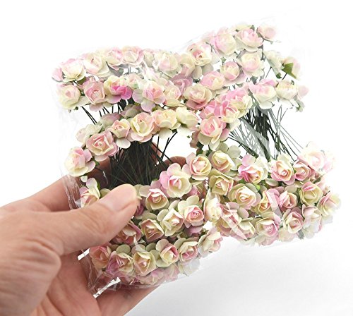 FiveSeasonStuff 144 Pezzi Miniatura Rose Artificiale Mazzo di Fiori, Ideale per Scatole di Favore di Nozze, Partito, Fai da Te (Beige Rosso, 1.2-1.5cm)