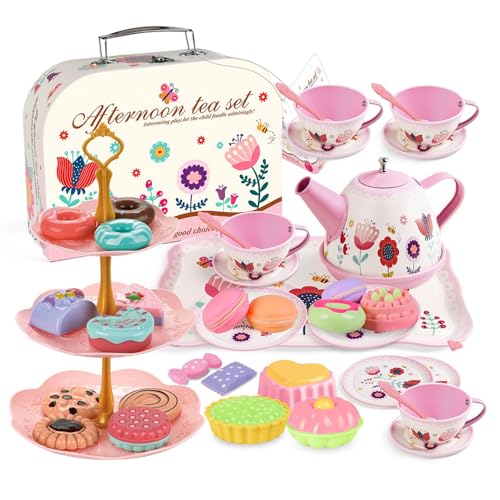 【46 Pezzi Servizio da Te Giocattolo】Adatto a 2-4 bambini per giocare come un tea party pomeridiano. Questo set da tè per bambini include 1 teiera, 1 vassoio da portata, 4 tazze da tè, 4 sottobicchieri, 4 piatti, 4 cucchiai, 1 alzata per torta a 3 livelli, 1 valigia, 20 pezzi di plastica ABS con una varietà di ciambelle, macaron e altro dolce. Le ricche aggiunte di dessert al tè creano ore di divertimento per i bambini.