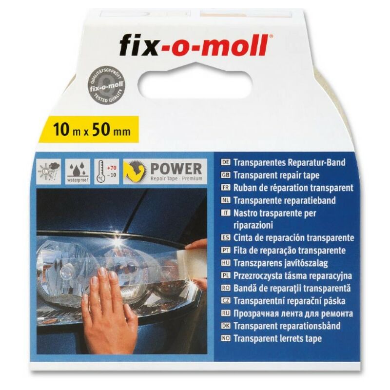 FIX-0-MOLL - 10mt x 50mm - NASTRO ADESIVO EXTRA FORTE PER RIPARAZIONI - COLORE TRASPARENTE Caratteristiche: La plastica trasparente e persino il vetro stesso possono essere riparati con il nastro di riparazione TRASPARENTE di fix-o-moll. Grazie alla sua resistenza alle alte temperature e agli agenti atmosferici, è flessibile da usare, rendendolo un aiuto perfetto anche in casa.