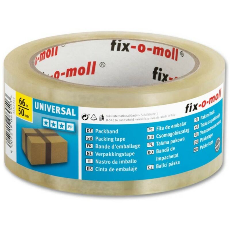 FIX-0-MOLL - 66mt x 50mm - NASTRO ADESIVO PER IMABLLO PACCHI UNIVERSALE - COLORE TRASPARENTE Caratteristiche: Il nastro per pacchi UNIVERSAL di fix-o-moll è un vero tuttofare. Affidabile, facile da erogare, fortemente adesivo ed estremamente resistente agli strappi, questo nastro è il prodotto perfetto per l'imballaggio e la nastratura. Realizzato in PP (polipropilene) con adesivo acrilico. Elevata forza adesiva, srotolamento silenzioso, non invecchia, privo di solventi. Colore: trasparente Dimensioni: 66 mx 50 mm
