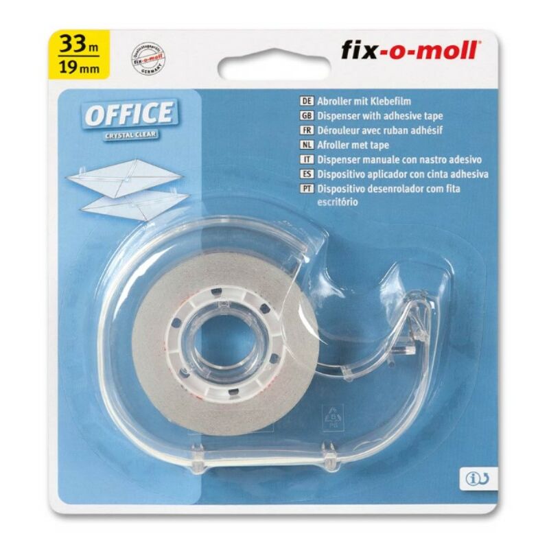 FIX-0-MOLL - 33mt x 19mm - NASTRO ADESIVO DA UFFICIO CON DISPENSER - COLORE TRASPARENTE Caratteristiche: Dispenser di pellicola adesiva fix-o-moll con pellicola adesiva, trasparente come se fosse invisibile, adesivo forte e resistente allo strappo. Ideale per riparazioni invisibili, fissaggi e imballaggi in casa, hobby e ufficio. Colore: trasparente Contenuto: 1 distributore di nastro adesivo, 1 nastro adesivo 33 mx 19 mm