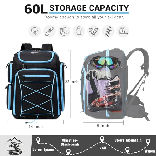 FIXITOK Zaino Borsa Portascarponi da Sci, 60L Zaino Impermeabile da Viaggio per Scarponi da Sci e Snowboard per Sci, Sci, Snowboard, Casco da Sci, Occhiali, Guanti per Uomini, Donne e Giovani