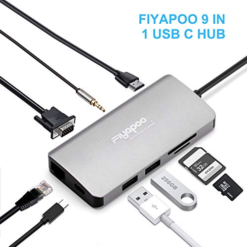 USB C Hub, FIYAPOO 9 in 1 Alluminio Adattatore USB C con HDMI 4K, 1080P VGA, Porta Ethernet RJ45, 2 Porte USB 3.0, Lettore di Schede SD/TF per MacBook Laptop etc
