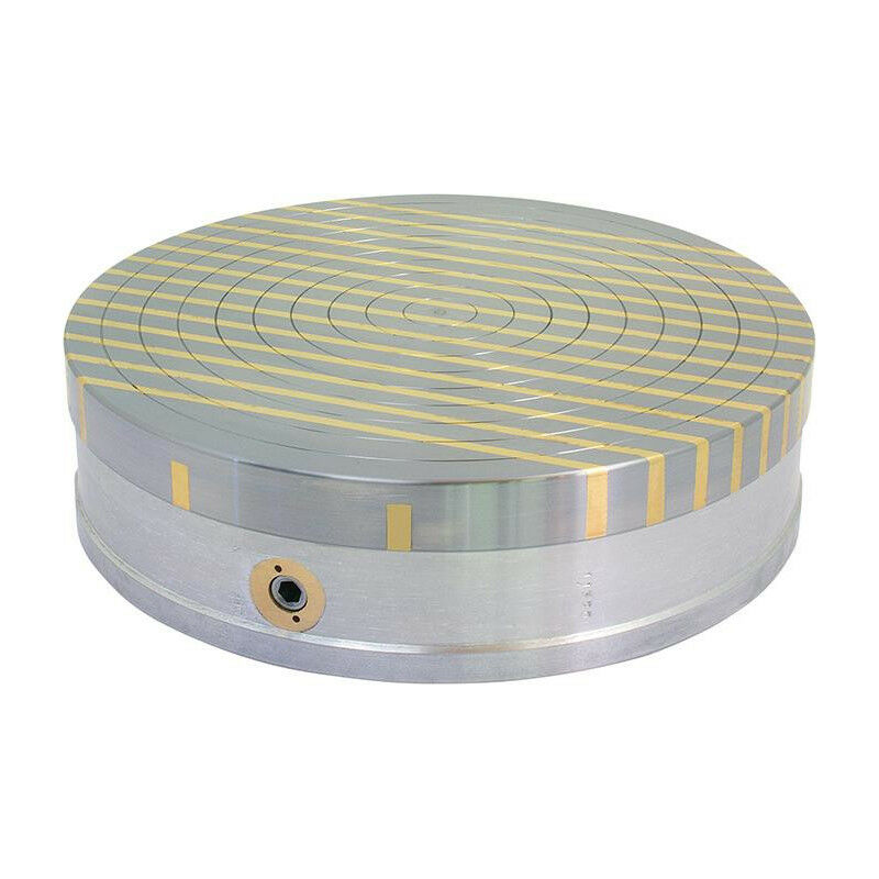 Mandrino rotondo magnetico permanente RM - Con sistema magnetico ceramico rinforzato e corpo base in alluminio - La piastra superiore può essere lavorata senza interferenze fino a una profondità di 8 mm - Forza magnetica regolabile in continuo - Le scanalature di centratura incorporate facilitano l'allineamento del pezzo. Inoltre, è possibile realizzare un foro di centratura nella superficie di serraggio - Per il serraggio di pezzi durante la tornitura. Anche per pezzi grossolani - Forza di tenuta: circa 140 N/cm² - Altezza del campo magnetico: circa 8 mm - Passo massimo dei poli: 5 + 8 mm. Passo dei poli: 5 + 8 mm
