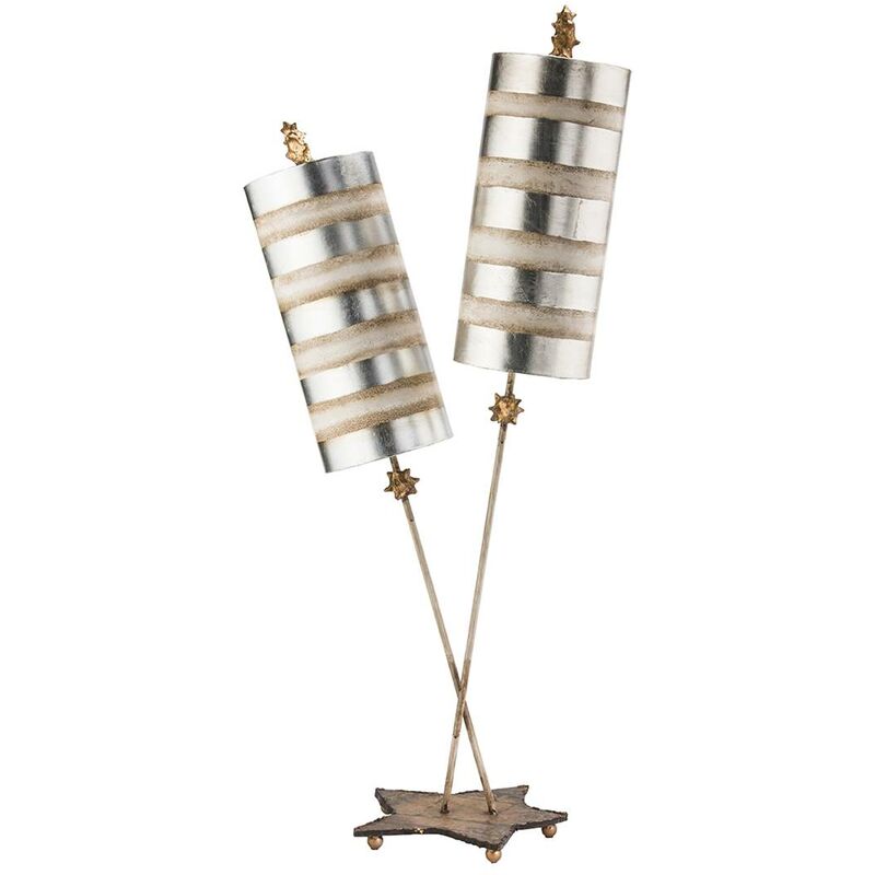 TABLE LAMPAGGIO NETTLE LUXE 2XE27 H: 102.7 L: 29 B: 49.5 Dimensioni in mm: Altezza: 1027, larghezza: 495, profondità: 290, Peso in kg: 5100 Lampade contengono: no Tipo di lampada/versione: E27 Massimo Performance in watt: 60 Dimmbar: no Classe di protezione: ip20 materiale per la casa: costruzioni acciaio Colore: foglia d'argento e crema