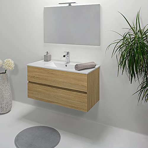 G flame Mobile Bagno 100 cm Sospeso Colore Rovere con Lavabo Specchio e Lampada Led