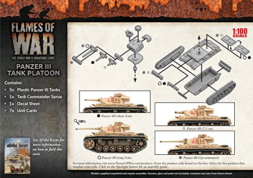 Contiene 7x carte unità, 5x Panzer III in plastica con cannoni e corazza personalizzabile, 1x sprue con i capicarro e 1x foglio con decals.