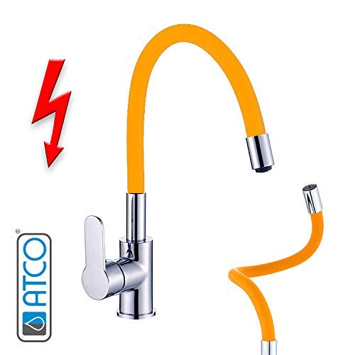 FLAMINGO - Rubinetto da cucina a bassa pressione con miscelatore monocomando per lavello da cucina, con beccuccio flessibile, colore: Cromo e arancione