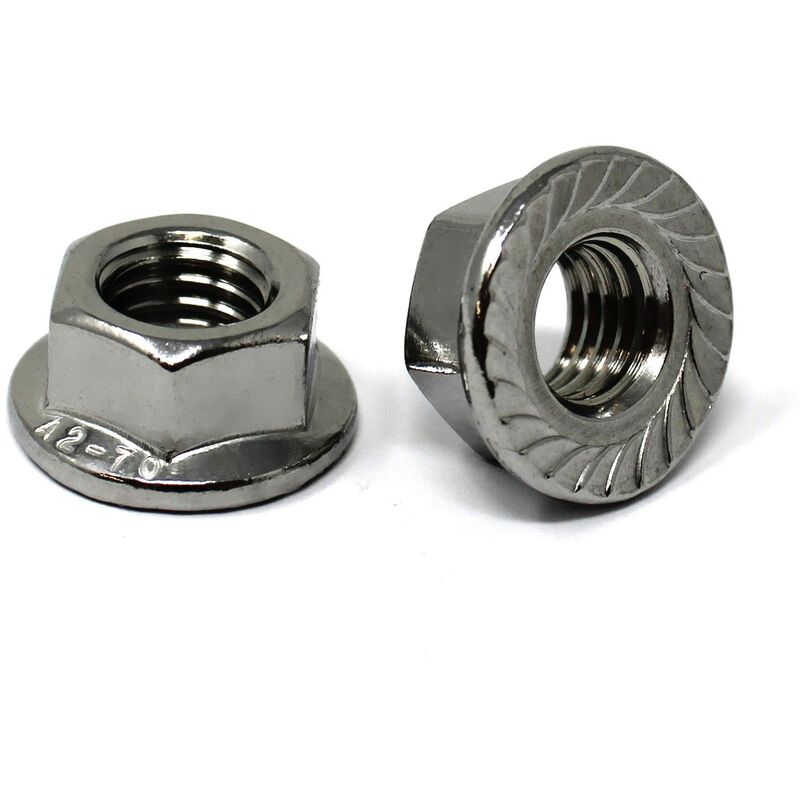 Il dado esagonale con flangia e dentatura di blocco o dado di bloccaggio è la forma trasformata del classico dado esagonale e appartiene al materiale di fissaggio standard. Anche questi dadi a flangia con nervature sono dotati di una filettatura interna metrica. Grazie alla dentatura delle nervature sulla superficie del materiale si crea una semplice chiusura a vite, che rende difficile allentare il dado. Grazie alla grande superficie di appoggio, questi dadi sono utilizzati volentieri per il fissaggio di lamiere adattatrici. Sono adatti anche per trasportare carichi dinamici come ad esempio vibrazioni e urti. A differenza dei classici dadi di sicurezza, questi dadi sono riutilizzabili e consentono di regolare in qualsiasi momento i collegamenti a vite. Si prega di notare che i materiali morbidi come l'alluminio e altri metalli leggeri potrebbero essere danneggiati dalla dentatura dura di bloccaggio. Grazie all'uso di acciaio inossidabile di alta qualità, il dado esagonale può essere