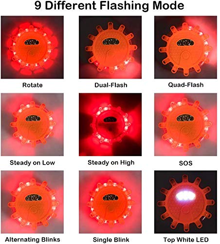 6PCS LED Road Flares Flashing Warning Light Emergency Disc Beacon with 9 Flash Modes,Magnetic Base and Hook Storage Bag Roadside Flashing Warning Lights for Car Truck Boats