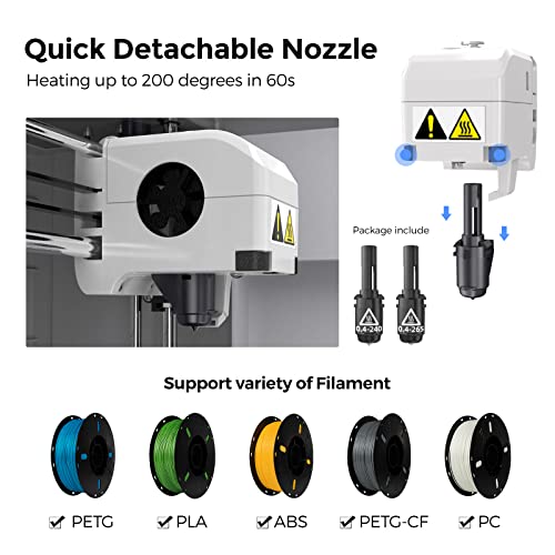 【Ugello Staccabile & Stampa Ultra-mute】Estrusore rimovibile brevettato, con ugello 0.4mm 240 ° C & 265 ° C, rimuovere l'ugello dall'estrusore solo in una spinta, riscaldare a 200 ° C (392 ° F) entro 60 secondi. Suoni di stampa≤45db, assicura un ambiente di stampa silenzioso e confortevole.