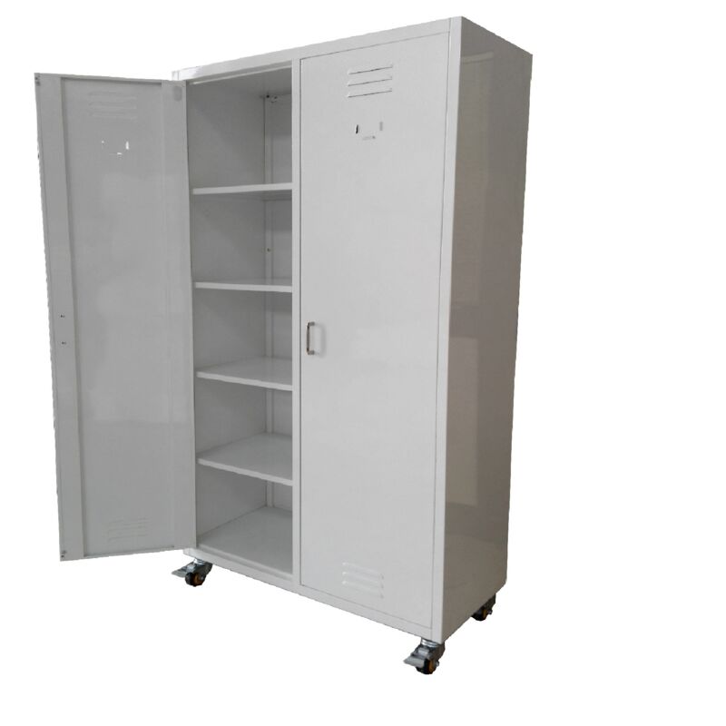 ARMADIO GUARDAROBA IN METALLO CON RUOTE .Dimensioni (cm): larghezza 85 x profondità 40 x altezza 180 Costruito in lamiera d'acciaio alta qualità Lato Dx dotato di n°4 ripiani in metallo spessore 8/10 regolabili ed amovibili, Lato Sx dotato di ripiano superiore ed asta appendiabiti e ganci, 4 Ruote 2 Ante a battente Dotato esternamente di feritoie di aereazione. Disponibile nei colori: Rosso, Bianco, Grigio Antracite o Verde Militare