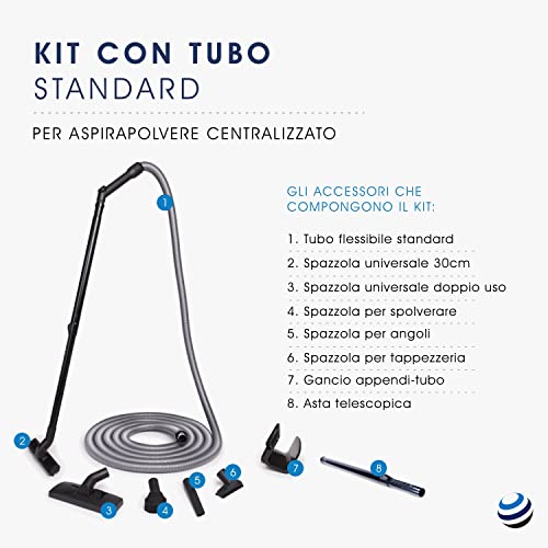 Il kit raggruppa i principali accessori per aspirapolvere centralizzato: tubo flessibile, gancio appenditubo, spazzola universale 30cm, spazzola doppio uso, lancia per angoli, spazzola tappezzeria, spazzola per spolverare, asta telescopica in alluminio.