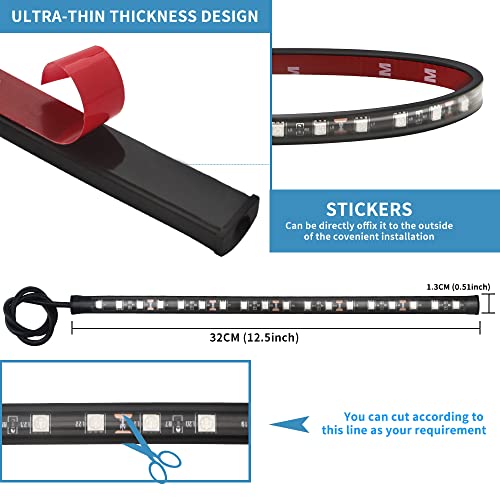 Uso sicuro: le strisce luminose a LED per auto sono dotate di protezione da cortocircuito e funzione di memoria. IP67 impermeabile, flessibile, resistente ai raggi UV e all'acqua. Può essere utilizzato in caso di maltempo. Ultra sottile, può essere facilmente installato tra lo spazio e praticamente invisibile;
