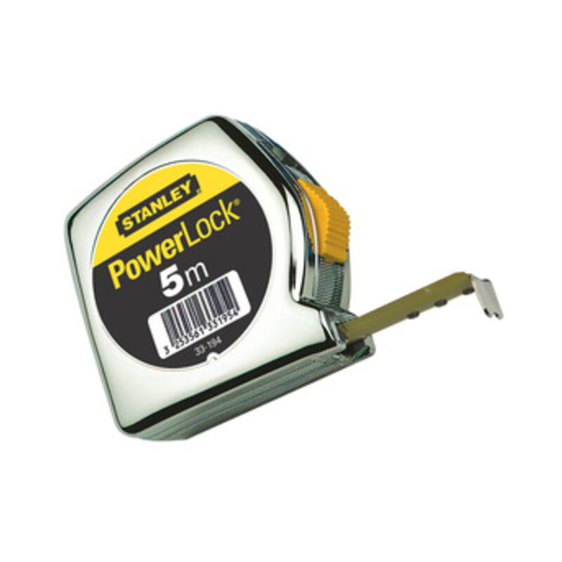 Mod. POWERLOCK Art. 33.195 cassa cromata in materiale sintetico. Nastro in acciaio al carbonio rivestito in Mylar. Clip di aggancio. Ritorno automatico. Nastro largo 25 mm. Lunghezza 5 m.