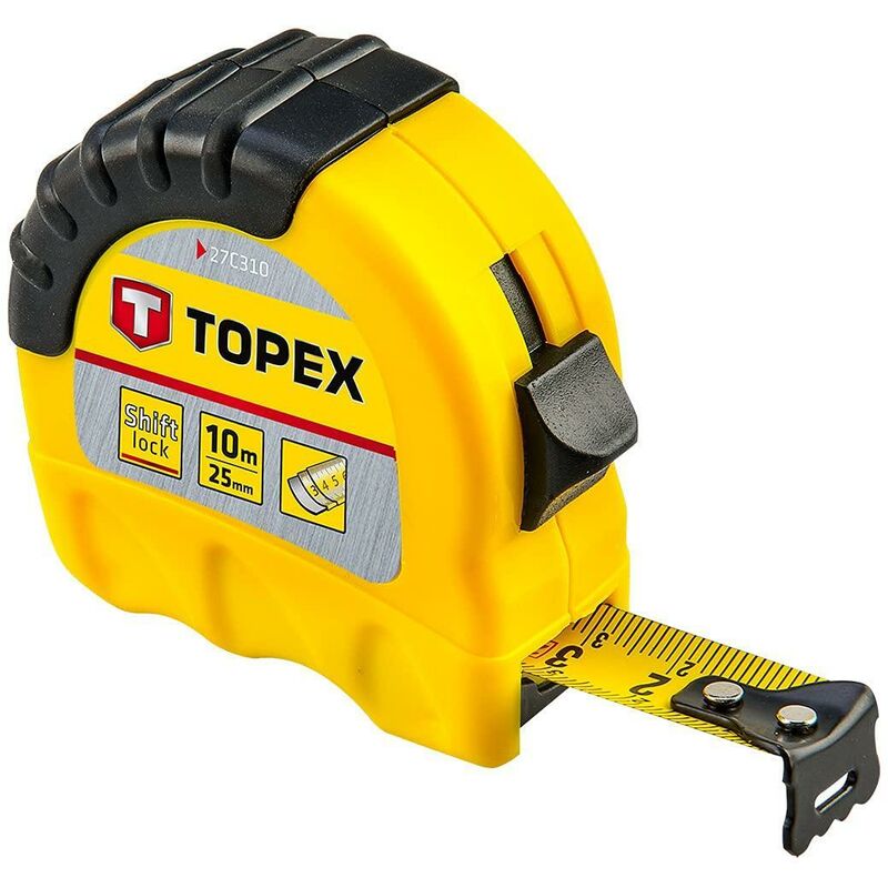 Flessometro, metro a nastro estendibile TOPEX in acciaio 10m x 25mm, GTO 27C310 Flessometro in acciaio TOPEX, metro per misurazioni precise, autobloccante.Il metro tascabile in acciaio è dotato di dispositivo di blocco dell'avvolgimento del nastro. La doppia lacca protegge la scala metrica stampata dall'usura. Il paraurti di avvolgimento del nastro protegge il fermo dalla rottura. La forma ergonomica dell'involucro consente una presa salda e confortevole e il materiale antiscivolo garantisce comfort e sicurezza sul lavoro. Il certificato MID garantisce l'affidabilità. Lunghezza: 10m Larghezza nastro: 25mm Modello: 27C310