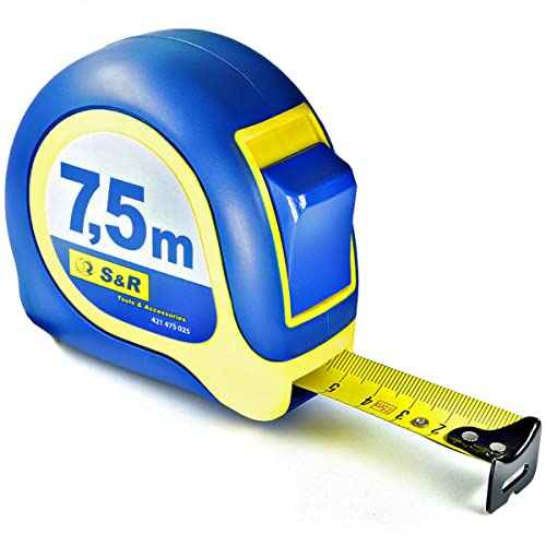 S&R Flessometro 7,5 m x 25mm, Metro a nastro Professionale resistente agli urti. Ergonomico e gommato serie MUSTANG