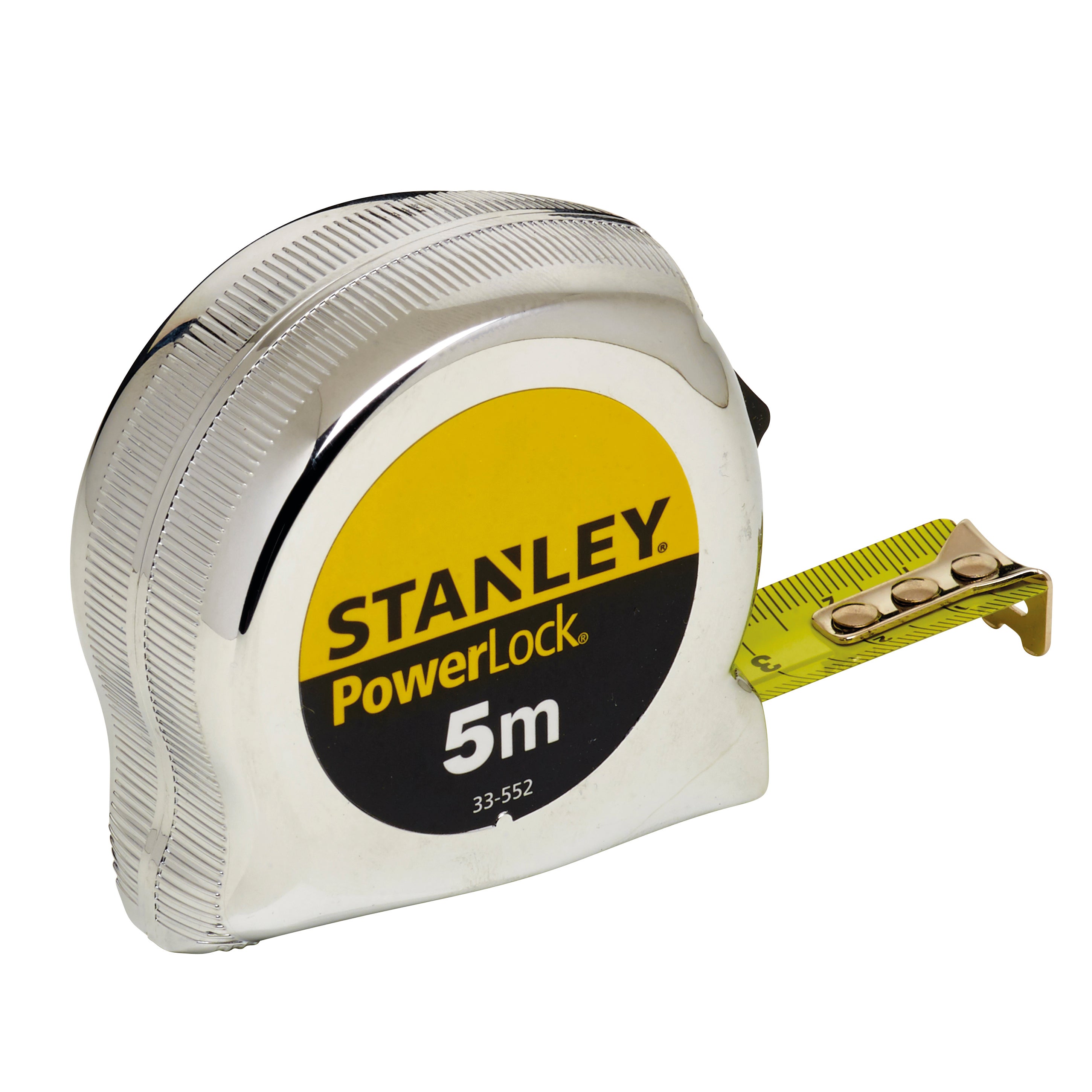 Flessometro pieghevole in acciaio, lunghezza 5 m, larghezza 19 mm. Cassa cromata molto compatta. Nastro a spessore maggiorato, non flette fino a 2,4 m. Pulsante di bloccaggio del nastro, clip di aggancio alla cintura. Rivestimento del nastro in Mylar per resistenza all'abrasione. Rientro morbido del nastro. Gancio a 3 rivetti