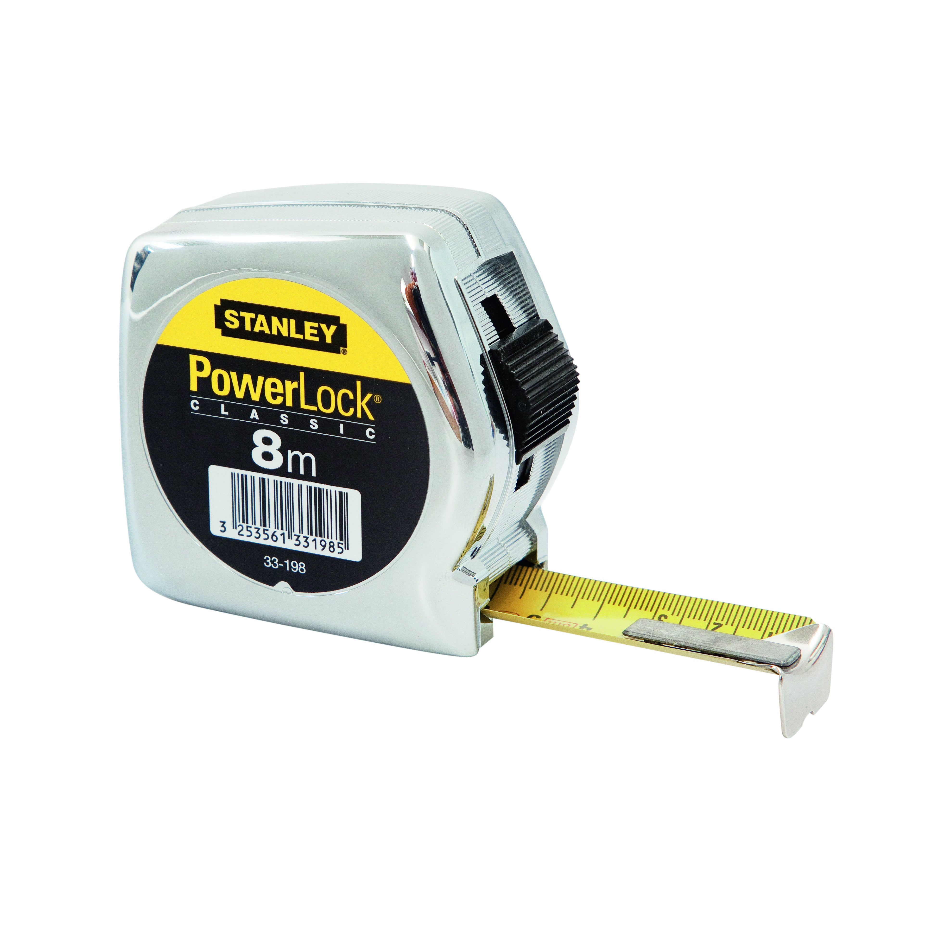 Flessometro pieghevole in acciaio, lunghezza 8 m, larghezza 25 mm. Nastro in acciaio al carbonio rivestito in Mylar®, clip di aggancio, dotato di pulsante di bloccaggio e rientro autamatico. Classe di precisione II