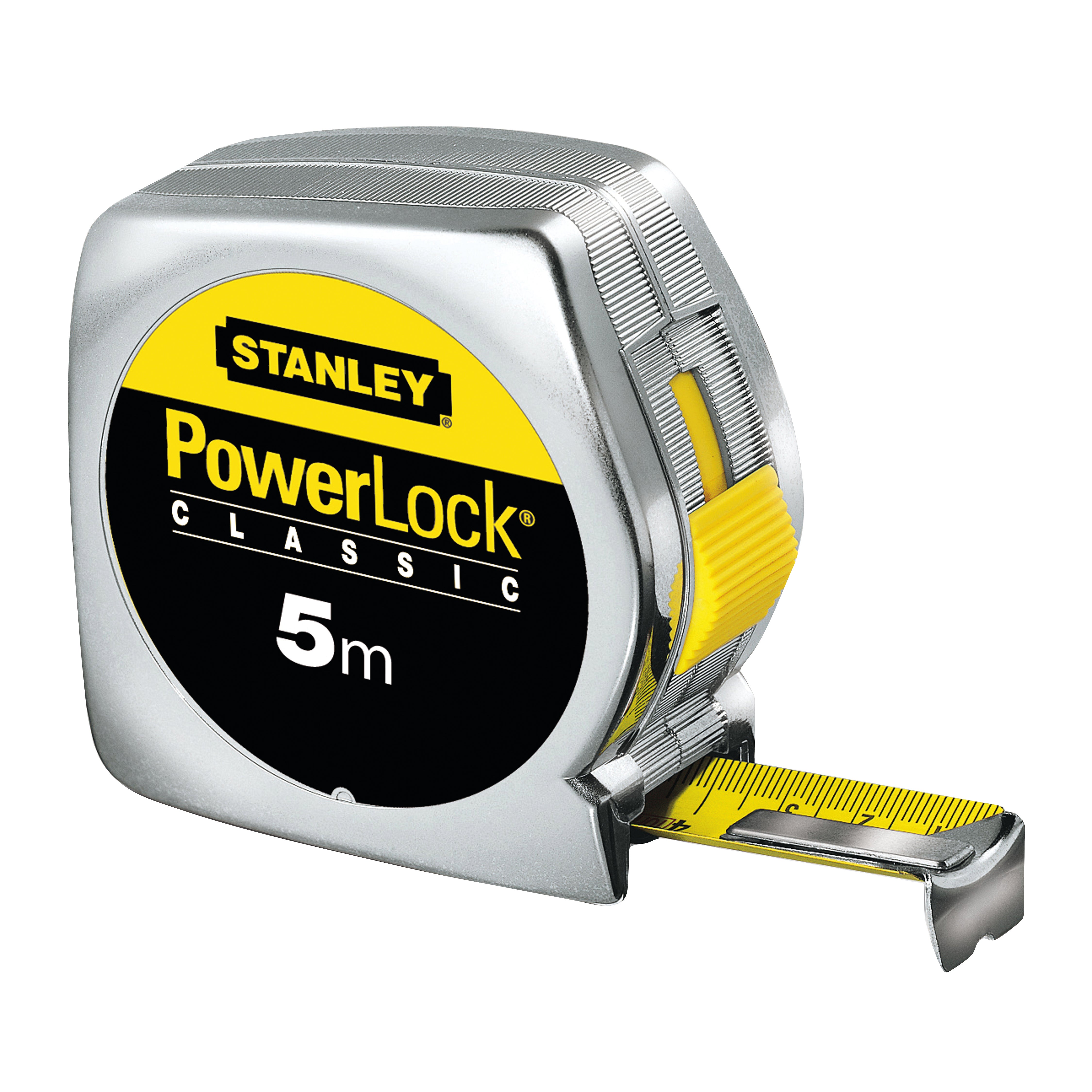 Flessometro pieghevole in acciaio, lunghezza 5 m, larghezza 19 mm. Nastro in acciaio al carbonio rivestito in Mylar. Clip per aggancio alla cintura. Rivetto pieno