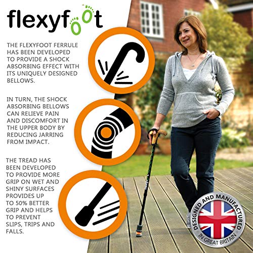 Questo piedino nero da 19 mm per bastone da passeggio Flexyfoot dal design ottimo e brevettato garantisce l'assorbimento degli urti, riducendo la sensazione di colpo solitamente percepita quando il bastone impatta sul suolo e contribuendo così a ridurre il dolore alle articolazioni e ad aumentare il comfort