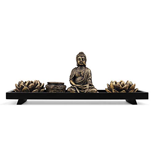 Flexzion Kit giardino zen sabbia candele per arredo interno, Oggetti accessori per meditazione asiatico, statua di buddha porta candele bruciatore incenso bastoncini infusori pietre pace relax