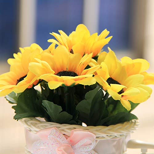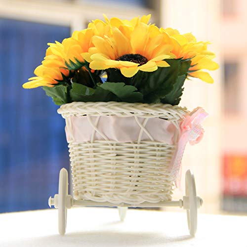 Flikool 2pz Fatto a Mano Rattan Triciclo Bici Artificiale Cesto di Fiori Vaso con Girasoli Finti in Seta 8 Teste Disposizione Floreale Decorativi Piante Artificiali per Scrivania Casa Partito-Bianca