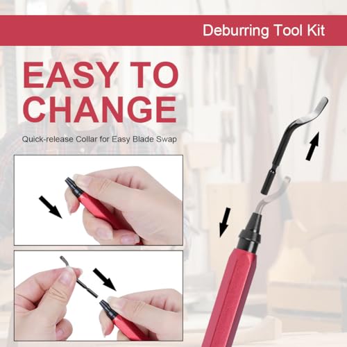 【UTILIZZO FLESSIBILE】: le lame di sbavatura con design girevole a 360 gradi sono ideali per fori trasversali, fori profondi o bordi curvi. Basta sostituire la lama premendo il pulsante sull'impugnatura di sbavatura, facile da installare.