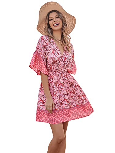 Stampa floreale Boho ditsy, scollo profondo, scollo a V profondo, maniche corte, cravatta frontale, nodo frontale, vita elastica, linea, abito corto