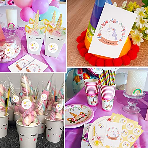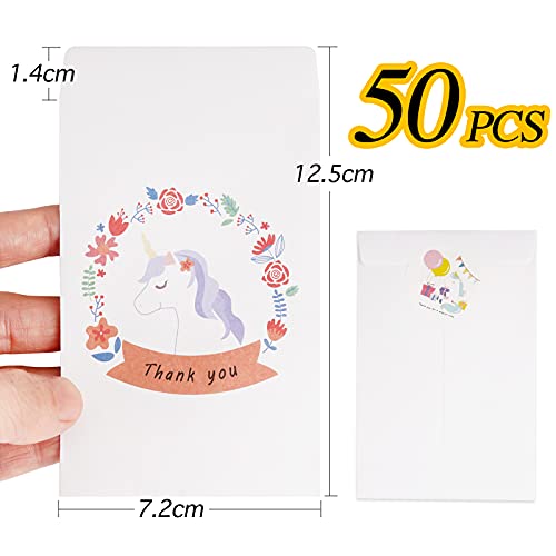 FLOFIA 50pz Sacchetti di Carta Kraft Bustine Sacchettini Mini Busta Epoca Kraft per Confetti Confettata Caramelle + 60pz Adesivi Etichette Chiudipacco per Regalo Natale Bomboniere Matrimonio Unicorno