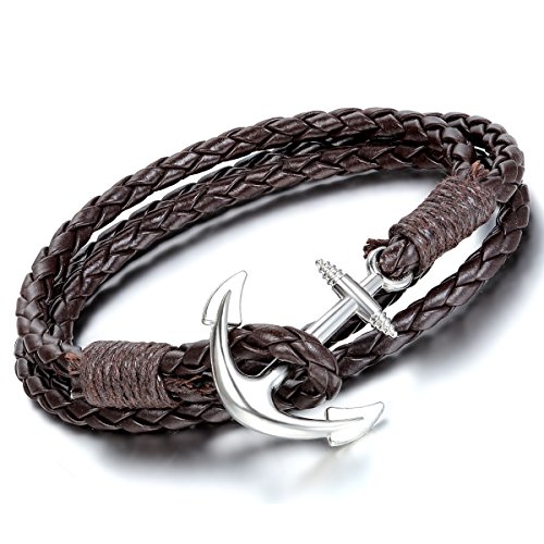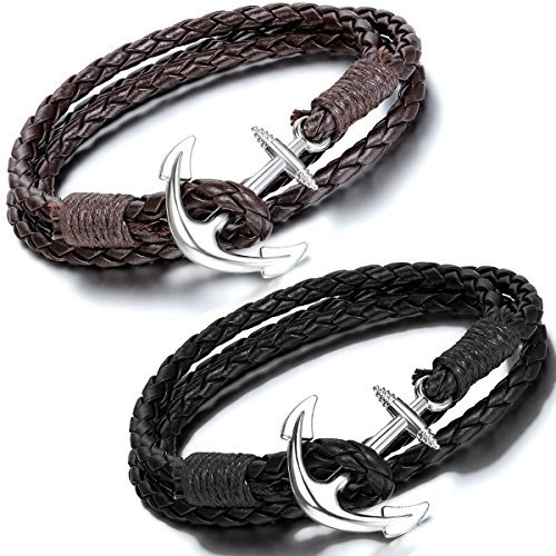 Flongo 2 pcs Set Bracciale Braccialetto Retro Tessere da Mano Multi Strati Ancora Decorato in Pelle Leather