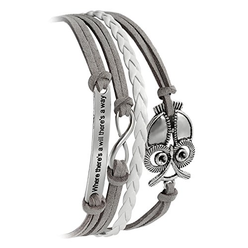 Flongo Gioielli Bracciale da Donna Chic Boemia, Fili intrecciati braccialetto bianco retrò vintage, Ciondolo Gufo Where there´s a will there´s a way, Buon regalo