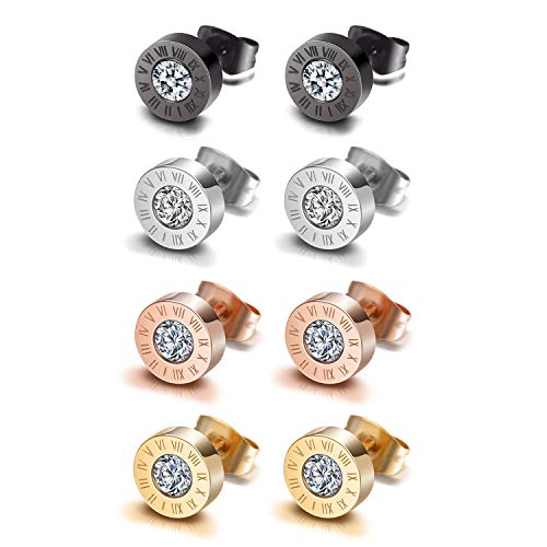 Flongo 4 Paia Orecchini da Uomo Donna, 1.1cm con Diamante Numeri Romani, in Acciaio Inossidabile con Zircone, Orecchini Piercing spine del Tunnel