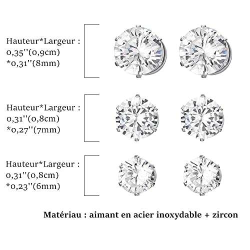 Flongo 3 paia di orecchini da donna senza foro, orecchini a perno con zirconi, orecchini da uomo, argento nero, oro, finto plug senza foro, set per appuntamenti, banchetti, feste