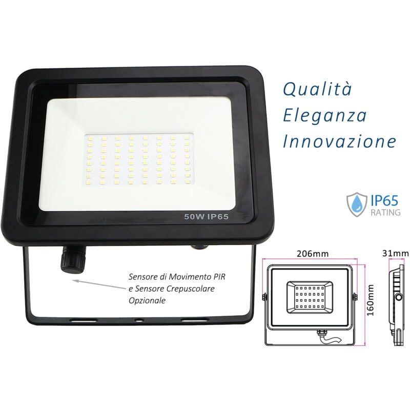 Un Faro Proiettore a Led Slim Con Carcassa Nera Molto Elegante Sensore Movimento PIR e Sensore Crepuscolare Opzionale(Si Acquista Con SKU:CL1918) Super Slim Solo 31mm di Spessore e IP65 Uso esterno e Interno 220V 50W=500W Incandescenza e Bianco Neutro (circa 4500K) Omologazione CE e RHOS,Garanzia 24 Mesi Marca LEDLUX Codice Prodotto FE38050N Voltaggio Alimentazione AC220V- AC240V 50/60Hz Potenza Nominale 50W Luminosità 4000 Lumen Colorazione 4000K-4500K Dimmerabile NO Angolo Illuminazione 160° Valore CRI RA>80 Fattore di Potenza > 0.90 Tipo di Attacco Con Gancio Grado di Protezione IP65 Durata >30000 Ore Temperatura di Lavoro -20°C- +60°C Dimensione 206X160X31mm Omologato CE e RoHS SI Nota Bene Questo faro led ha possibilità di aggiungere un sensore PIRIl sensore PIR si acquista a parte con codice SKU: CL1918