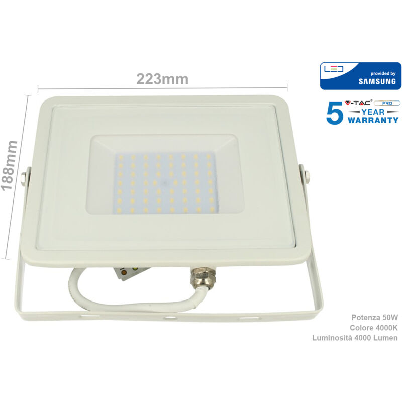 Un Faro Proiettore a Led 50W 220V Super Slim Solo 28mm Spessore Con Carcassa Bianca Molto Elegante IP65 50W Super Luminoso 4000lm Biano Neutro 4000K Angolo 120 Gradi Con Smd Samsung Garanzia 5 Anni (2+3) Marca V-TAC Codice Prodotto FE6050N Dimmerabile NO Voltaggio AC220-240V 5060Hz Potenza 50W Luminosità Circa 4000 Lumen CRI RA>80 Angolo Luce 120 Gradi Numero di Led 56 smd SAMSUNG Colore Bianco Neutro Circa 4000K Impermeabilità IP65 Misura(mm) L223*W188*H28 Peso Circa 1 KG Durata 30000 ore Omologazione SI, CE e RoHS Nota Bene Led Samsung,Garanzia 5 Anni (2+3)