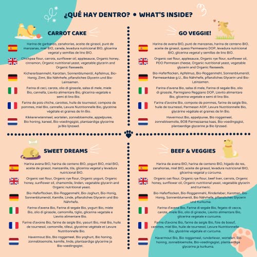 ❤️ Confezione di cibo per cani 100% naturale. Vi presentiamo il modo più sano e nutriente per dare al vostro cane dei bocconcini. Realizzato con ingredienti naturali al 100%. Questi bocconcini per cani sono facilmente digeribili. Prodotto con ingredienti conosciuti, senza sale o zuccheri aggiunti, senza conservanti o coloranti. Senza olio di palma. L'integratore alimentare perfetto per i cani.