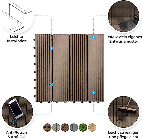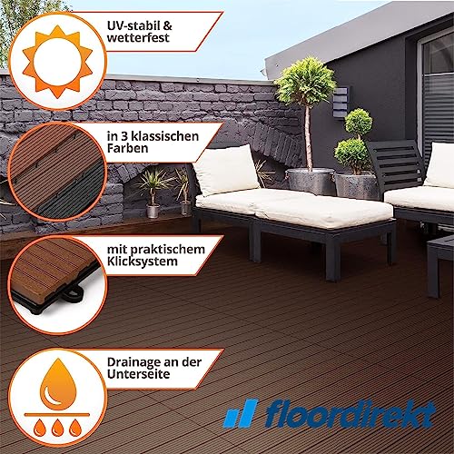 Floordirekt Piastrelle in WPC, 30 x 30 cm, 2 m² = 22 piastrelle per terrazze, piastrelle a clic, per balconi e terrazze, resistenti alle intemperie, con funzione di drenaggio, marrone scuro, Royal