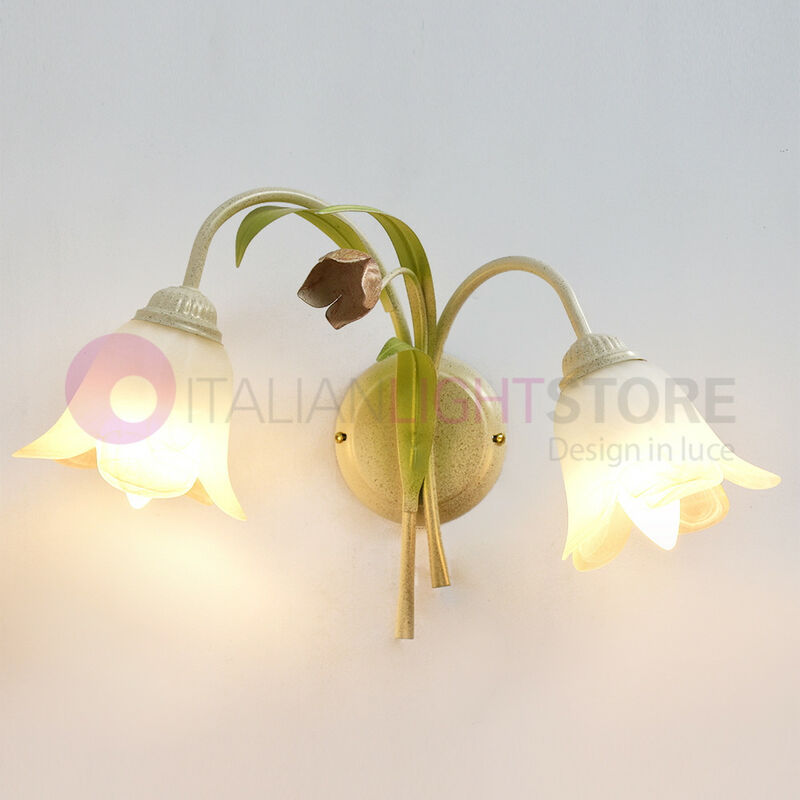 Lampada decorativa a parete, in stile classico fiorentino, con diffusori in vetro a forma di fiore. Lampada a parete, applique a 2 luci con struttura in ferro sagomato, verniciato avorio e decorato a mano con sfumature oro, diffusori a forma di fiore in vetro alabastro con sfumature ambra. FLORA è una linea di lampade delicate e sinuose, dai toni caldi, completa di lampadari, lampade da soffitto, da tavolo e a parete, ideale per illuminare con originalità e un tocco di colore cucine, saloni e camere in stile classico, rustico o country chic. ELETTRIFICAZIONE: E14 - 2 X MAX 40W Lampadine non fornite (possono essere utilizzate lampadine a basso consumo o led con attacco a vite mignon E14). CLASSE DI PROTEZIONE: IP20 (per interno);